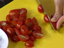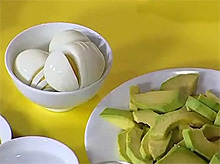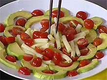 Cắt nguyên liệu: Đầu tiên, bóc vỏ bơ và cắt thành lát vừa ăn. Sau đó là cắt cà chua thành từng khoanh.