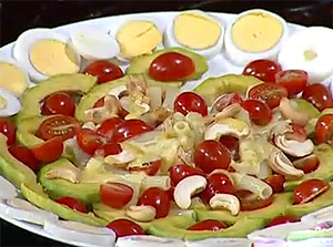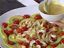 Xếp bày salad; Xếp xen kẽ cà chua, bơ, trứng, cho nui vào giữa. Sau đó rắc hạt điều và rưới hỗn hợp nước xốt lên.