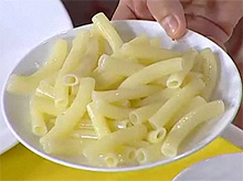 Bóc vỏ trứng gà xong cũng cắt khoanh. Nui luộc chín để nguội